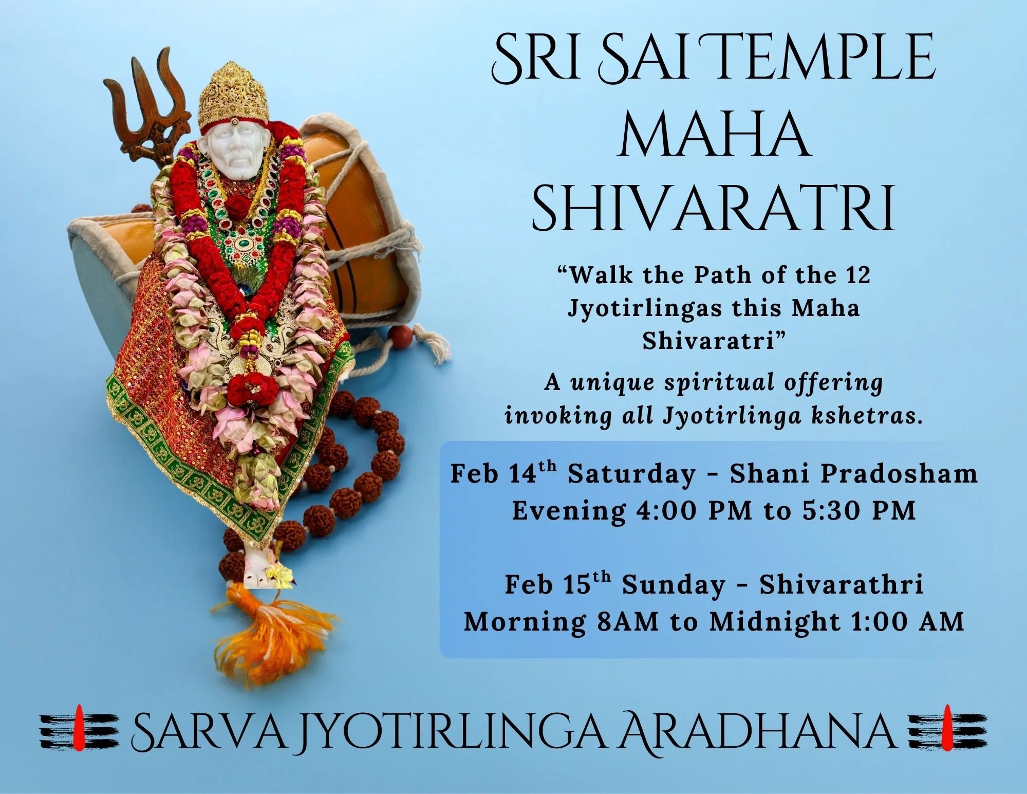 On the sacred night of Maha Shivaratri, Sri Sai Temple invites devotees to perform Sarva Jyotirlinga Aradhana, reverentially invoking the presence and blessings of all twelve sacred Jyotirlingams.